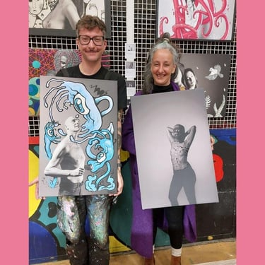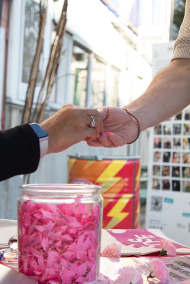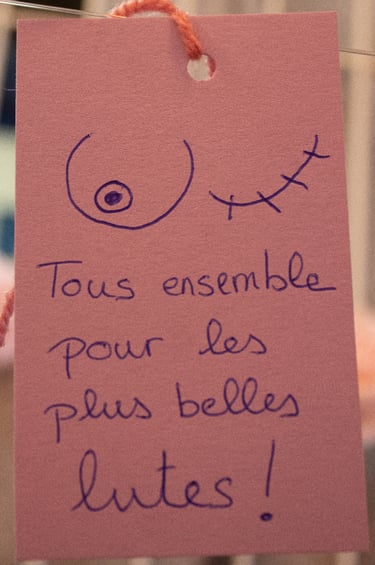 Vente de rubans roses, Atelier participatif d'écriture de mots de soutien, live painting, bra-challenge, auto-palpation